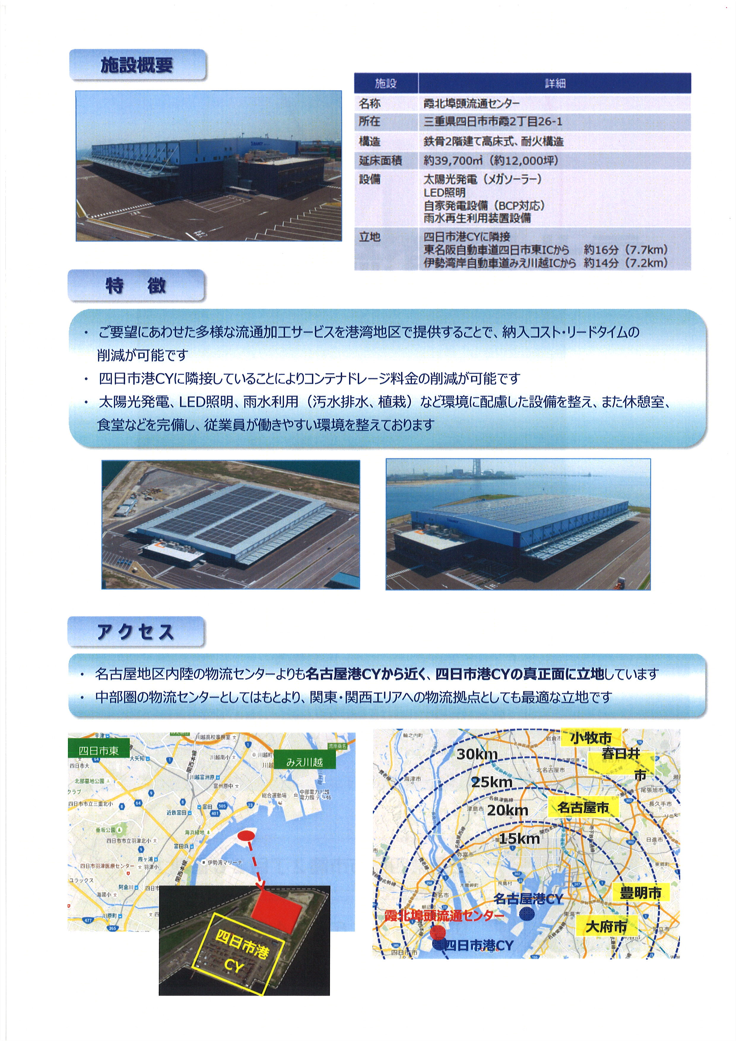 日本トラスシティ株式会社と伊勢湾倉庫株式会社の共同出資により設立された霞北埠頭流通センター株式会社により、霞北埠頭流通センターが2017年5月25日に竣工しました。翌5月26日には当協議会の名誉会長である鈴木三重県知事並びに森四日市市長の立ち会いのもと、竣工式典が執り行われました。5月29日より、営業を開始しております。